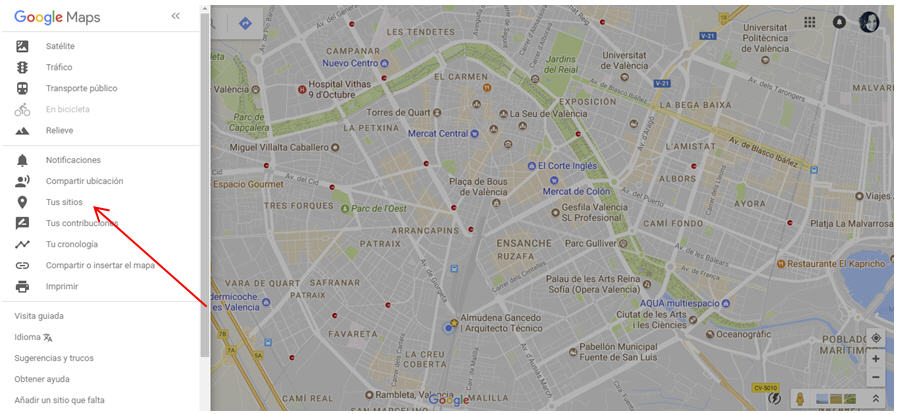 Accediendo al menú del mapa, que es el icono de barras situado a la izquierda, se despliega el contenido de este menú y accedemos a Tus sitios